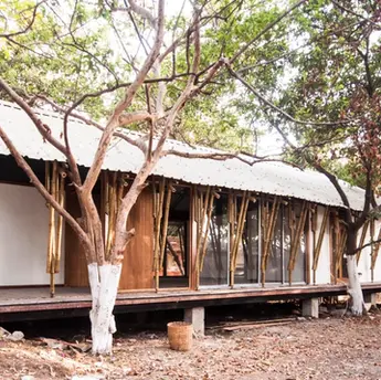 Despite the restrictions, this bamboo cottage features architecture that is clean, deliberate, and honest. The bamboo structure rests on an extended plinth, carrying the weight passed down by the bamboo trusses in a lightweight roof. Below, wattle and daub walls bring an earthy tactility, grounding the cottage in its natural surroundings.