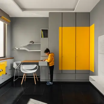 The house is an exercise in precision- meticulously planned to honor Vastu principles while meeting the evolving needs of its occupants. The south facade remains solid, responding to the neighbouring plot, while vertical punctures across the home ensure daylight filters in from the east, west and north, softening the dense urban footprint. The custom ceramic facade lends dynamism to the structure, ensuring that every level of the house remains connected in spirit, even when physically apart – whilst modulating daylight, airflow, and privacy.