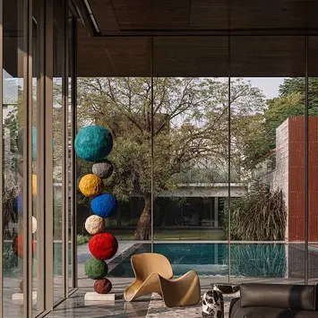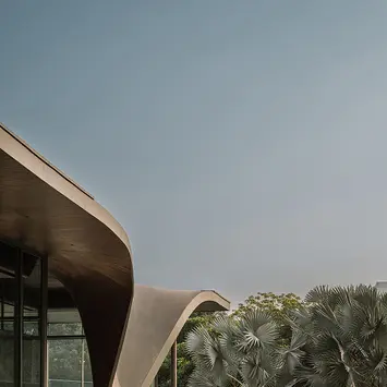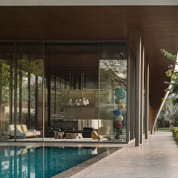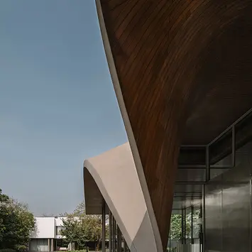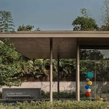 Set within an existing residential landscape in Ahmedabad, the Dip Pavilion is designed for evening life beside the pool—part lounge, part gym, always in conversation with the garden. The project is organised as a linear, transparent volume held beneath a singular roof plane. Full-height glazing keeps sightlines uninterrupted across the site, while a slender structural system sits beyond the glass—columns placed outside the enclosure to preserve the lightness of the interior and establish a measured rhythm. The roof becomes the project’s primary identity: a thin horizontal plane that extends across the site and then descends to touch the ground, shaping a sheltered entrance. This movement creates a controlled tension between sky and earth without breaking the clarity of the glass volume. From key vantage points in the main residence, the roof reads first—anchoring the pavilion within the larger property.