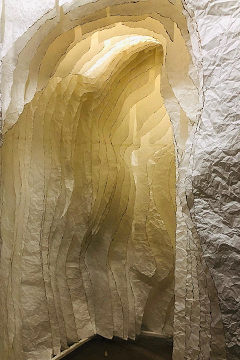 Stitched together into suspended panels, paper forms an enclosure that isn’t fixed but flexible. The fire-scorched edges mark a threshold, a deliberate contrast between material softness and elemental force.