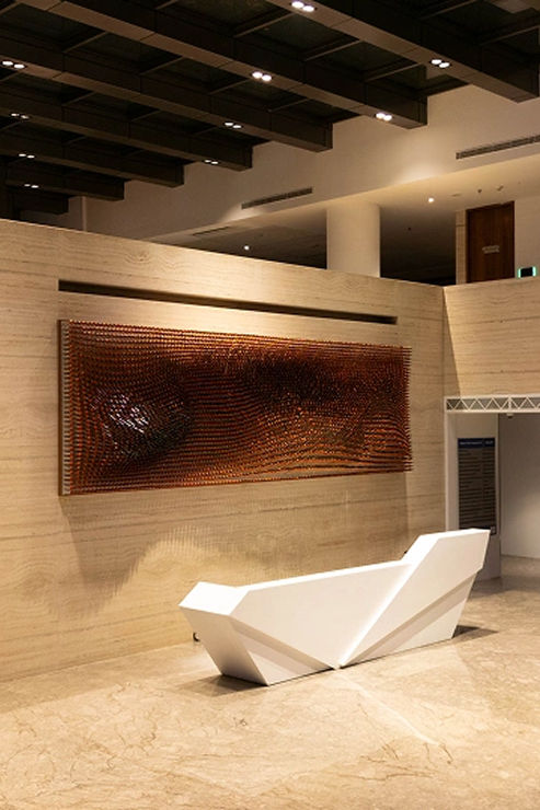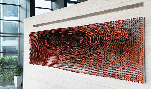 Through a rigorously developed parametric logic, Vayu choreographs movement within a structured framework. The installation employs modular repetition to establish a rhythmic gradient, shifting between density and dispersion. Each component is precisely configured to react to air currents, creating a surface that oscillates between order and turbulence. The result is a field of controlled motion, where structure and flow exist in equilibrium.