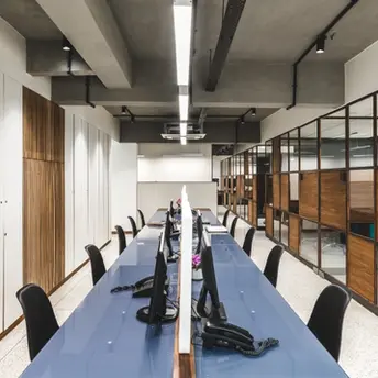 This office is designed for a pharmaceutical company unafraid to do things differently. Led by two dynamic founders, the space mirrors their forward-thinking mindset—eschewing clinical monotony for a more vibrant, layered environment. Every element is bespoke, shaped around function, movement, and identity. From the cylindrical paper lights at the entrance to the custom-built furniture, the office is a seamless fusion of aesthetics and utility. Pockets of color punctuate the interiors, strategically placed to energize the space, while greenery softens the rigor of work. The result is a workplace that fosters focus without sacrificing warmth.